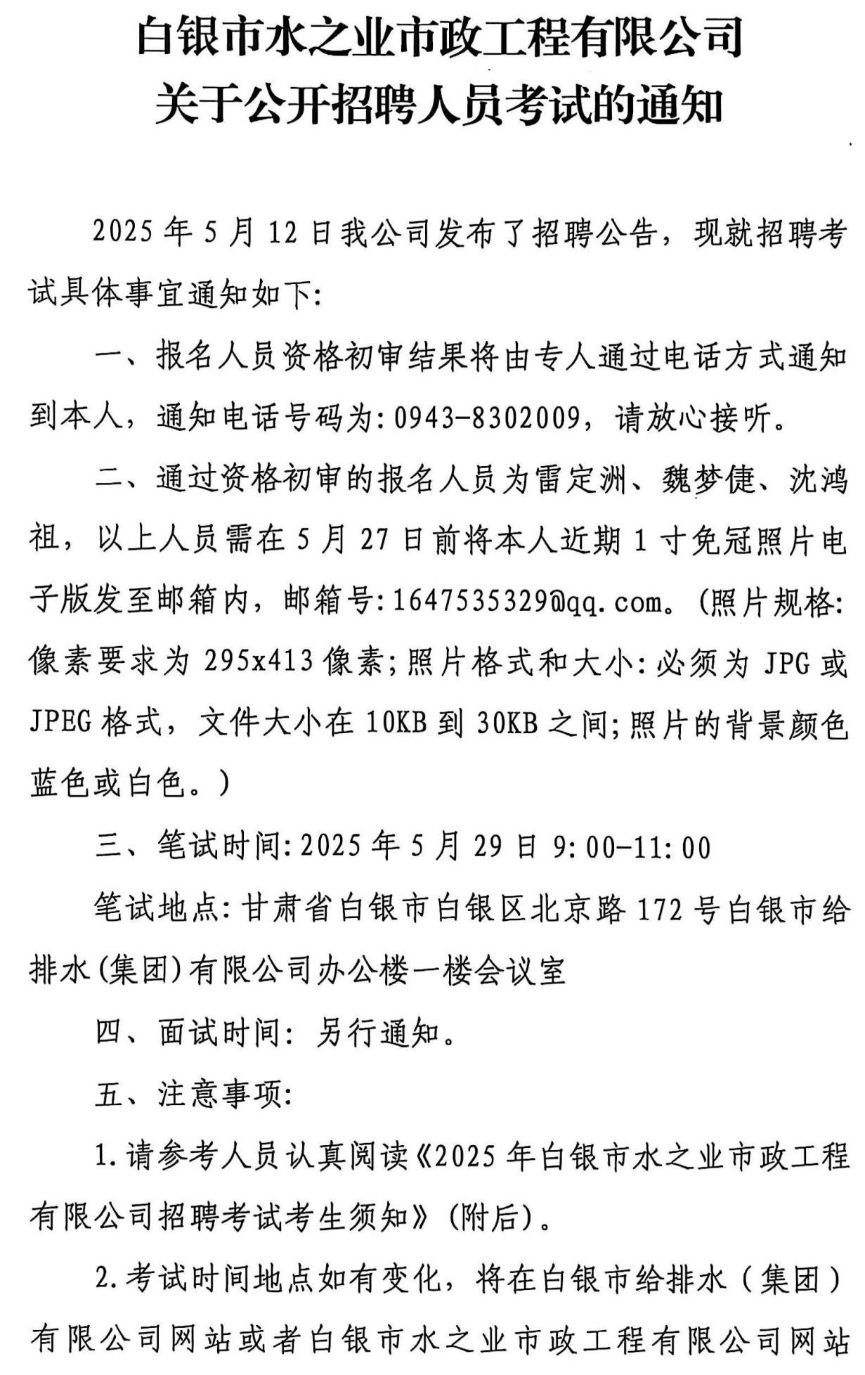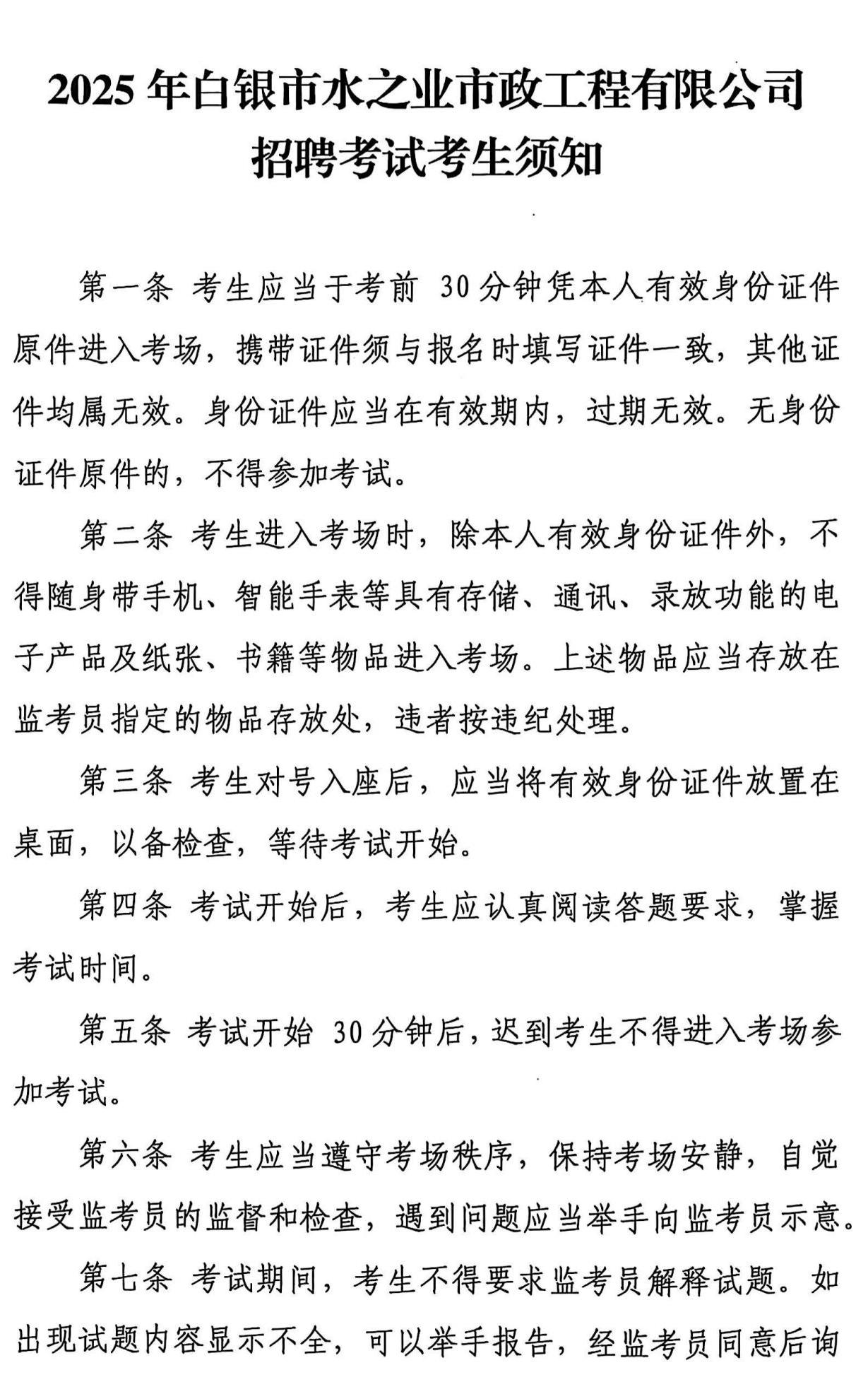 白銀市水之業(yè)市政工程有限公司 關(guān)于公開招聘人員考試的通知