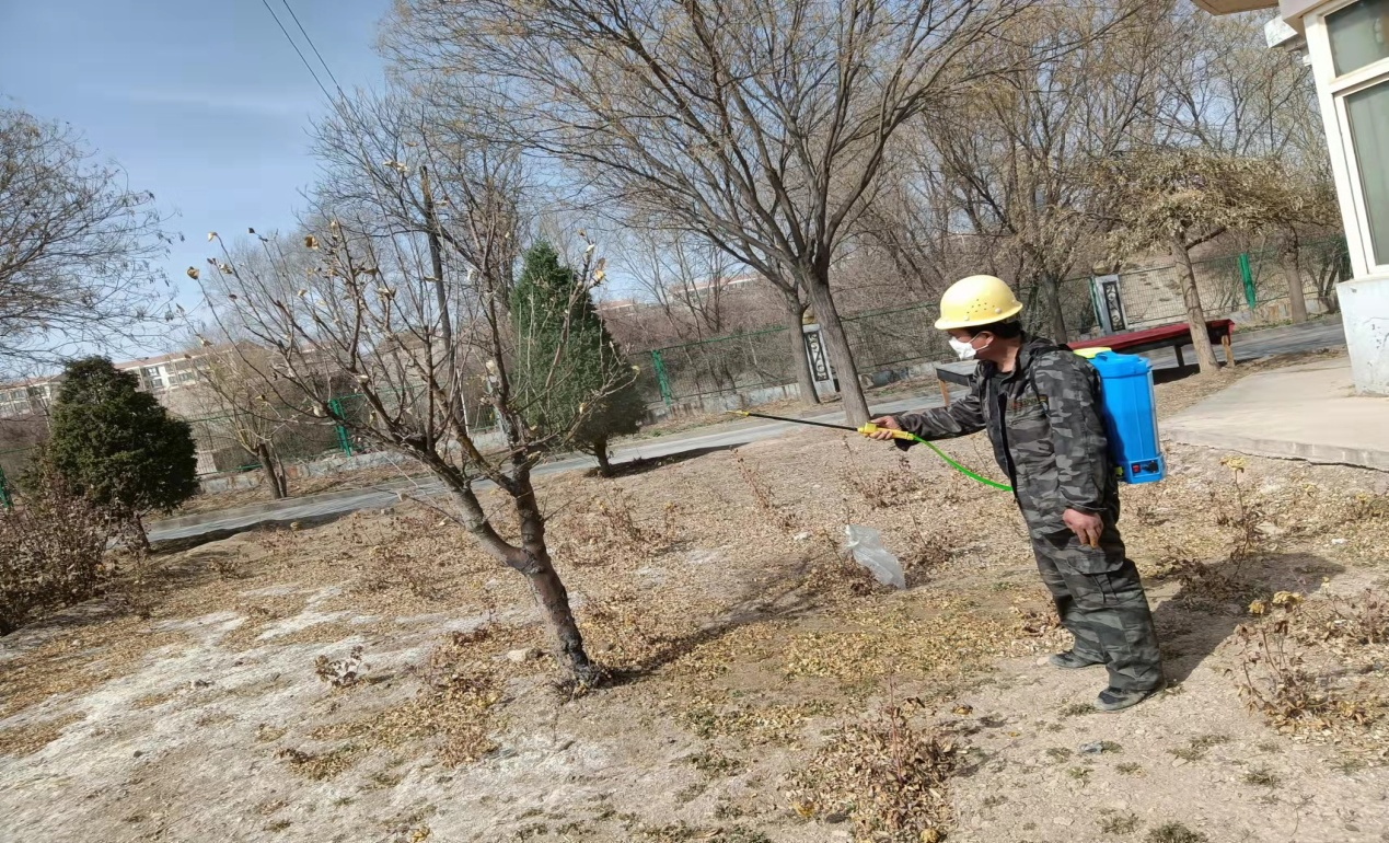 ?3月份公司工程部人員組織有序的開始綠化工程施工,如清理綠化地干枯葉,修整綠化地及給各樹木噴藥等一系列工作。